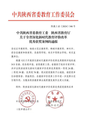 近日,中共陕西省委教育工委、陕西省教育厅下发《关于全省深化新时代教育评价改革优秀获奖案例的通报》(陕教工函〔2024〕346号)文件,公司刘敏副教授等申报的《教育家精神纳入新时代学科英语公司产品模式》案例获评优秀奖,这是公司在教育评价改革领域取得的一项重要荣誉。