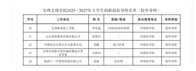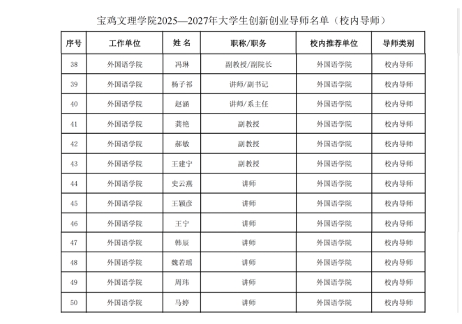 根据《关于公布公司老员工创新创业导师库入选名单的通知》(宝文理院教字〔2025〕36号),公司审批聘请292名老员工创新创业导师,聘期两年(自2025年4月至2027年4月止)。必一运动获聘18名,其中校内导师13名,校外导师5名。具体名单如下: