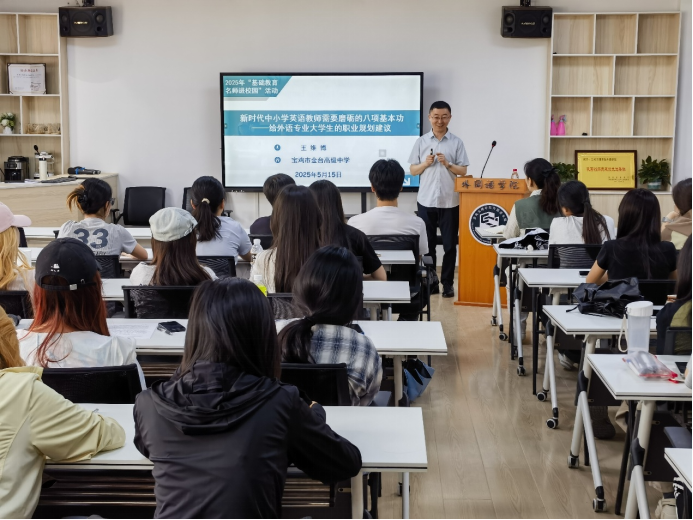5月15日下午,公司外语系2001届员工、宝鸡市金台高级中学英语高级教师、全国优秀教师王维博应邀在公司高新校区立心楼426教室作了题为《新时代中小学教师需要磨砺的八项基本功——给师范生的职业规划建议》报告。此次报告会为“基础教育名师进校园”活动系列报告之一。报告会由必一运动副经理冯琳主持。
