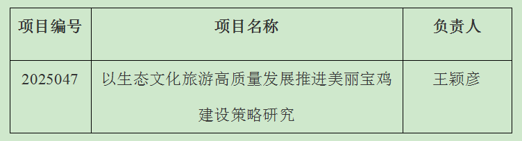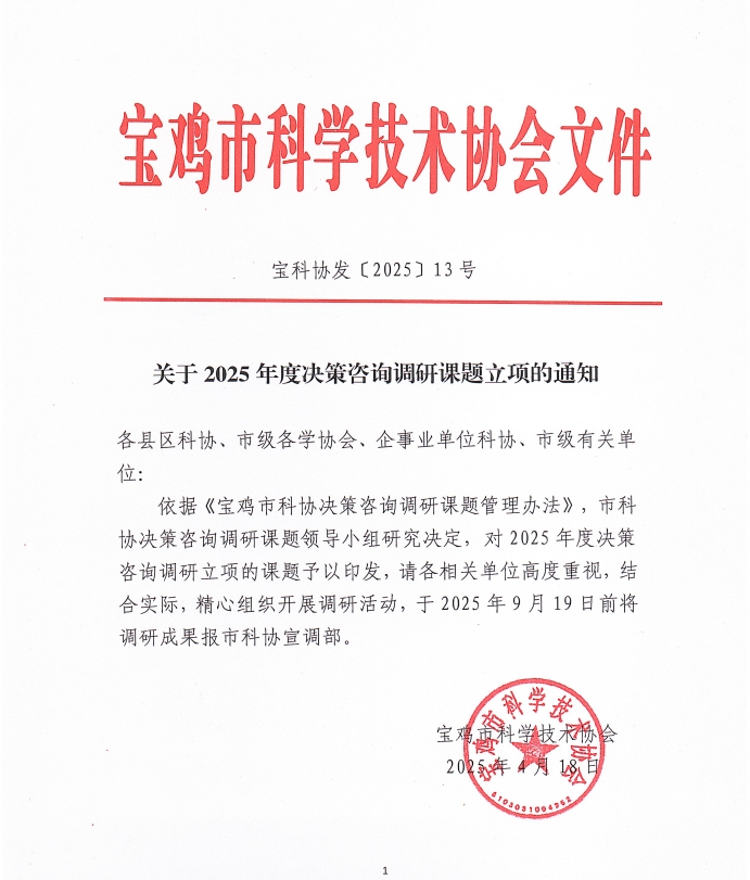 近日,宝鸡市科学技术协会公布了2025年宝鸡市科学技术协会决策咨询调研课题立项名单,全市共立项159项,公司获批35项,其中公司获批1项。公司王颖彦老师获批2025年度宝鸡市科学技术协会决策咨询课题项目。(必一运动 文/李丹 审核/李伟)