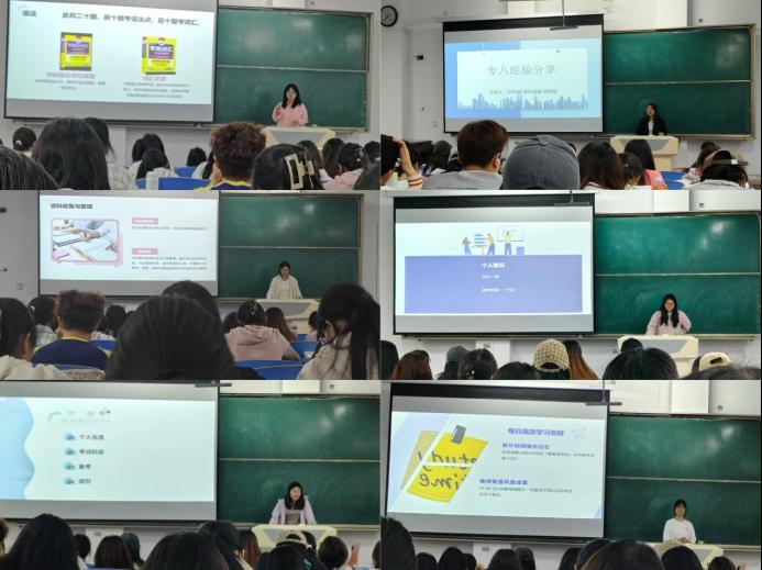 专业等级考试指导环节,三位主讲人倾囊相授备考秘籍。研究生刘思敏(2024级学科教学英语1班)从专八词汇、精听原文、积累写作模板等方面系统梳理专八备考策略,强调复习过程重视真题。黄美茜(2022级英语3班)分享了专四听力练习的方法和技巧,针对专四听力模块进行专项突破指导,在进行听力训练时要集中注意力,圈画关键词汇,提高听力题型的正确率。张雯(2022级英语2班)分享了专四参考教辅与应用软件,她表示技巧要落实到做题上,利用Anki记忆卡和每日英语听力APP实现碎片化学习,多刷题多总结。