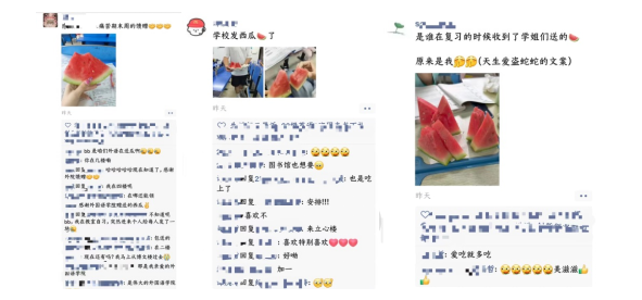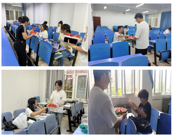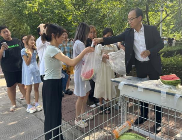 为了让外院学子第一时间品尝到西瓜,公司教师利用个人的周末休息时间,来到公寓为员工们发放西瓜,并根据员工需求,对西瓜进行切半、切牙。公司外酷暑难耐、烈日当头,公司里师生浓情、瓜果飘香。老师们为各宿舍依次发放西瓜,师生脸上都洋溢着欢乐的笑容,清凉的西瓜、公司老师的问候与备考祝福,驱散了员工由于天气和考试所带来的燥热,同学们都由衷地感谢公司党委带来的“清凉”。随后的两天,又安排员工党员干部到各个自习室和休息室持续发放西瓜。