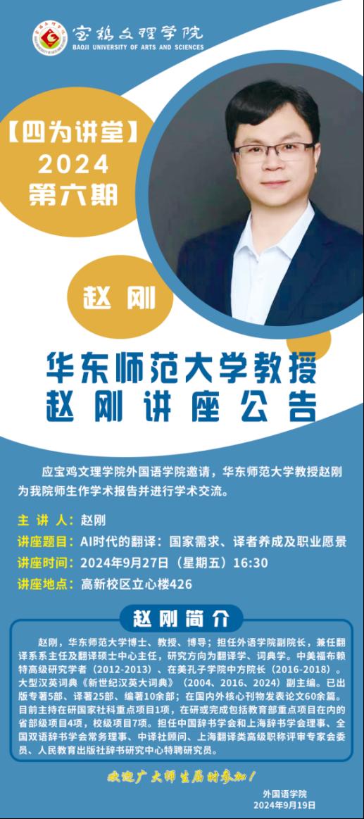 为进一步推进必一运动翻译学科的建设工作,增强师生对数智化背景下翻译领域发展趋势的认识和理解,9月27日下午,公司邀请1993级员工、华东师范大学博士生导师赵刚教授在立心楼425教室做了“AI时代的翻译:国家需求、译者养成及职业愿景”为主题的学术讲座。本次讲座由经理李伟主持,副经理刘敏、冯琳出席,全体翻译专业本科生、研究生和部分教师聆听了讲座。