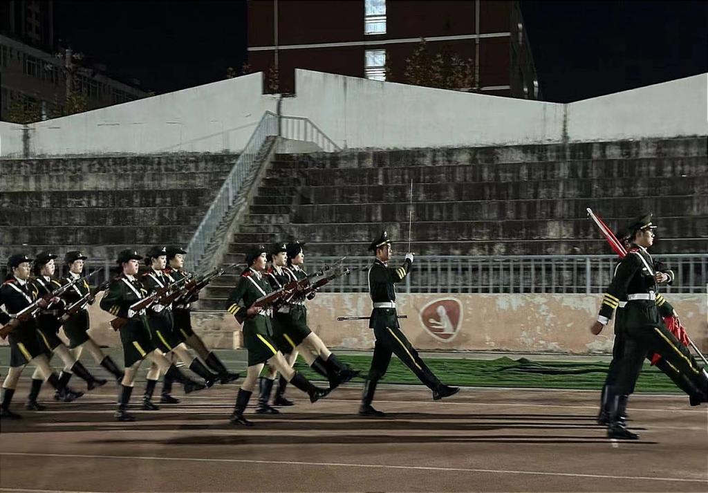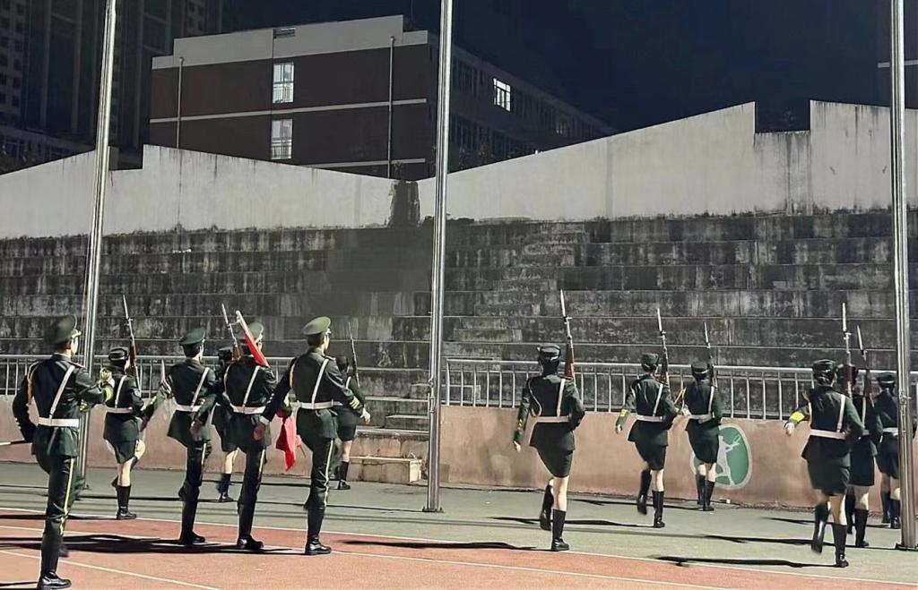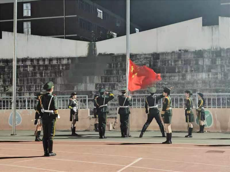 上午7时,伴着清晨微光,升旗仪式正式开始。迎着朝阳,国旗护卫队目光坚定有力,迈着整齐划一、铿锵有力的步伐护送五星红旗入场。在雄壮嘹亮的《义勇军进行曲》中,鲜红的五星红旗冉冉升起,全体师生肃然起敬,庄严面向国旗行注目礼,高声齐唱国歌,心中满怀着对党和国家崇高的敬意。