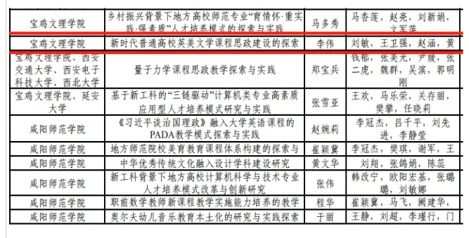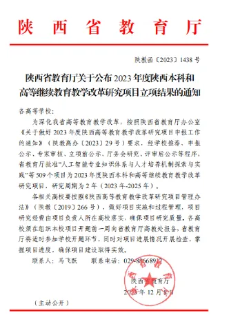 2023年12月,陕西省教育厅公布了2023年度陕西本科公司产品改革研究项目立项结果,公司李伟教授获批一般项目1项:新时代普通高校英美文学课程思政建设的探索与实践。该项目立项实现了公司省级教改项目立项零的突破,是公司公司产品改革和课程思政建设探索发展成效的体现。鱼为全、史云燕老师获得本科教学质量优秀奖。2023年老员工创新创业训练计划项目公司获得省级立项2项,校级立项6项;获批第十八批校级教学改革研究重点项目1项,一般项目4项。