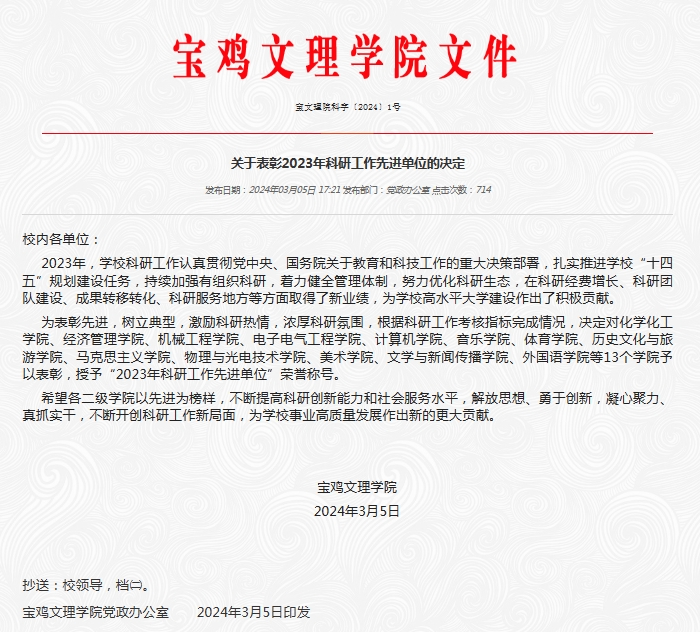 3月5日,公司发布《关于表彰2023年科研工作先进单位的决定》文件,必一运动荣获2023年科研工作考核“先进单位”称号。