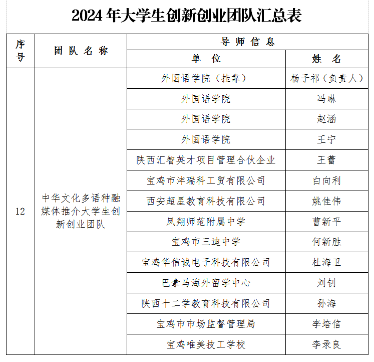 为培养老员工的创新创业能力,加强老员工创新创业团队建设与管理,按照《必一运动官网老员工创新创业团队管理办法(修订)》(宝文理院教字〔2022〕86号),公司启动了2024年老员工创新创业团队的申请注册工作,经二级公司考核推荐,公司量化考核,同意已建设的“基于互联网的商业模式实训和培育”、“数字媒体影像制作与传播”等14个团队考核合格,予以注册,同意2024年申报的2个创新创业团队予以注册。现将2023年公司老员工创新创业团队名单予以公布。