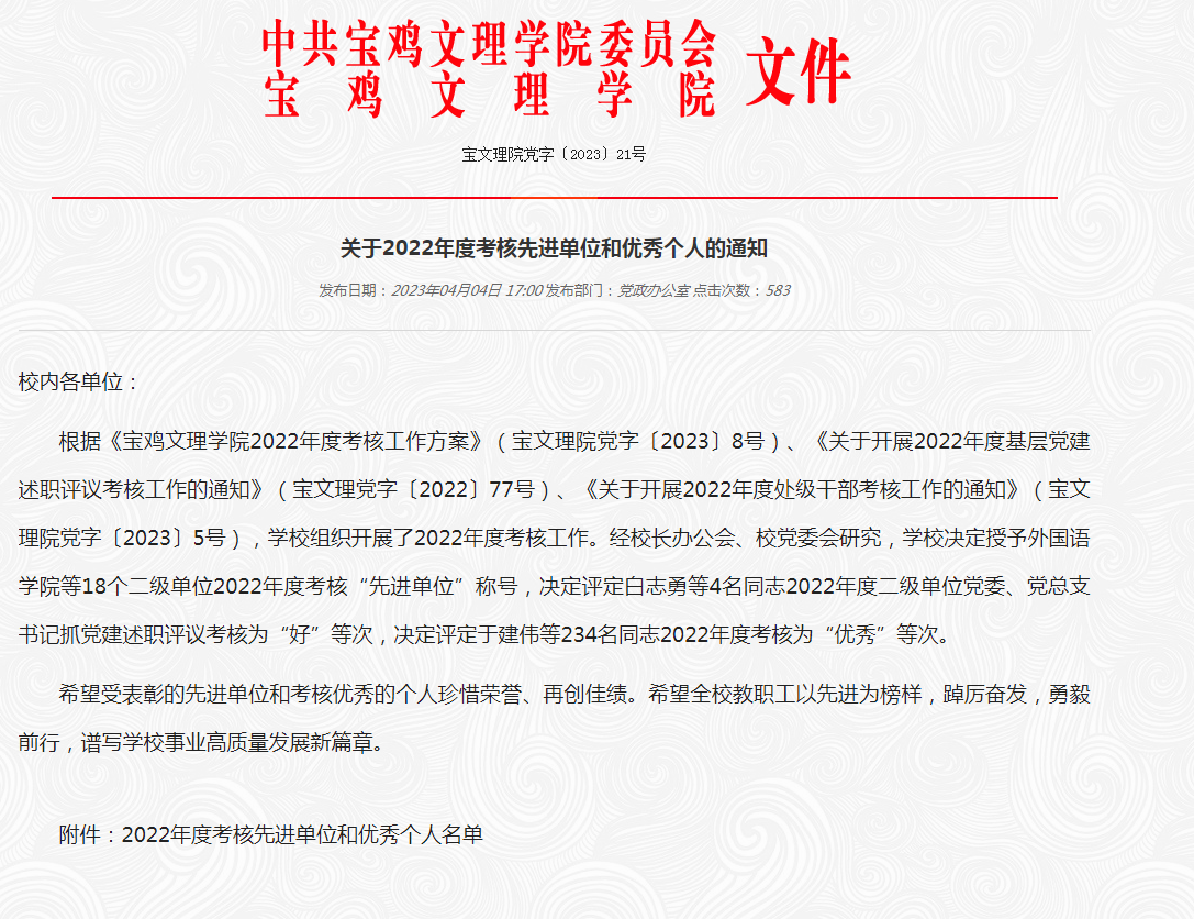 4月4日,公司发放了《关于2022年度考核先进单位和优秀个人的通知》文件,公司荣获2022年度考核 “先进单位”称号。