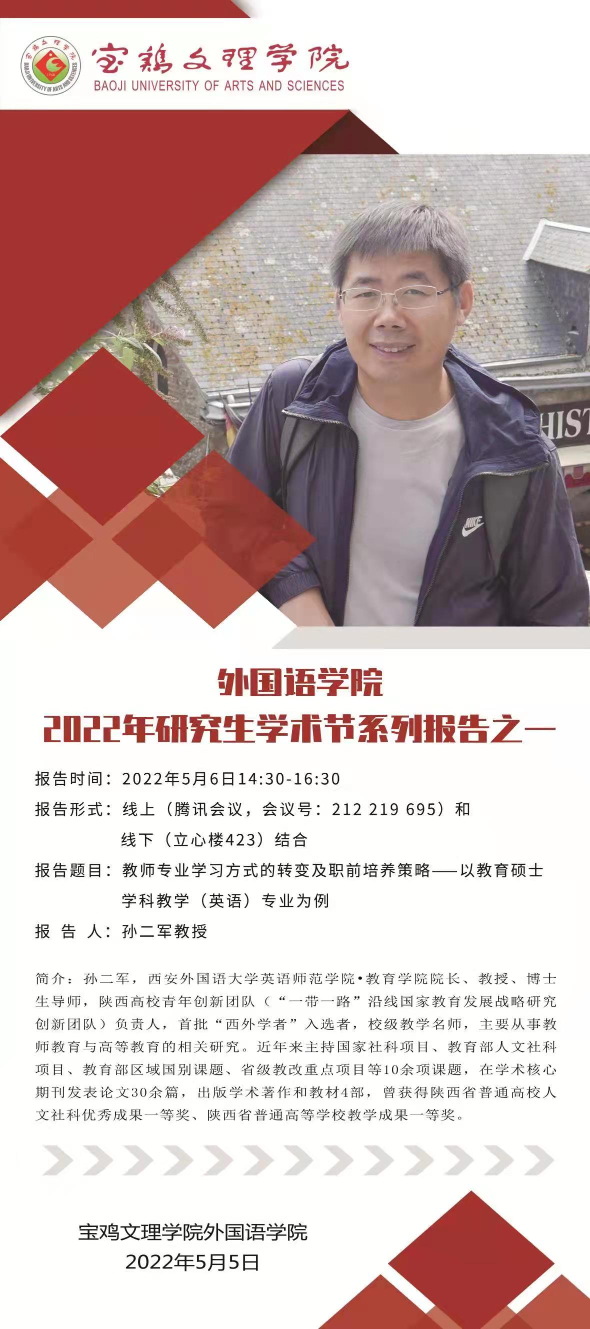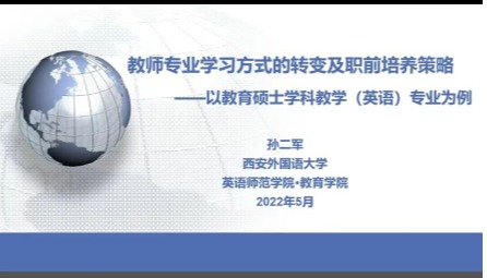 5月6日(星期五)14:30 -16:30,必一运动研究生学术节系列报告(第一场)顺利展开。本场报告特邀西安外国语大学孙二军教授,以线上(腾讯会议)、线下(高新校区立心楼425教室)结合的形式作了题为《教师专业学习方式的转变及职前培养策略——以教育硕士学科教学(英语)专业为例》的学术报告,必一运动经理李伟教授主持本场报告会, 全体2021级研究生、部分2020级研究生及教师聆听了此次报告。