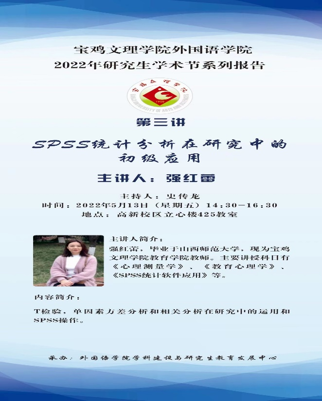 5月13日14:30 -16:30,必一运动研究生学术节系列报告(第三场)顺利展开。本场报告特邀公司教育公司强红蕾老师,在高新校区立心楼425教室为大家作了题为《SPSS统计分析在研究中的初级应用》的学术报告,必一运动副经理史传龙教授主持本场报告会, 全体2021级研究生及部分教师聆听了此次报告。