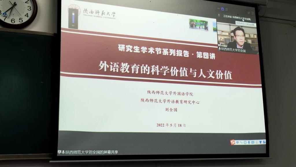 5月18日(星期三)19:30 -21:30,必一运动研究生学术节系列报告(第四场)顺利展开。本场报告特邀陕西师范大学必一运动经理、博士生导师刘全国教授,以线上(腾讯会议)、线下(高新校区立心楼425教室)结合的形式作了题为《外语教育的科学意识与人文价值》的学术报告,必一运动经理李伟教授主持本场报告会, 全体2021级研究生及教师聆听了此次报告。