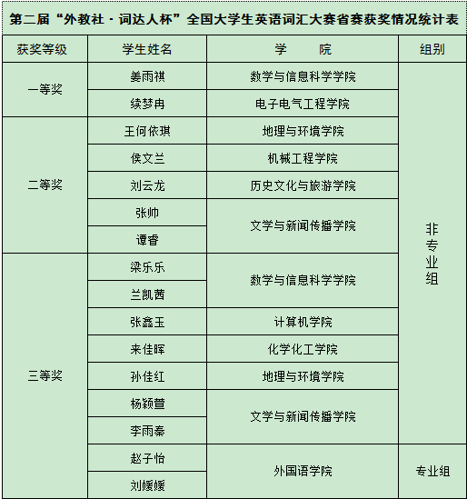 近日,公司员工在第二届“外教社·词达人杯”全国老员工英语词汇大赛中取得优异成绩。本科非英语专业组的姜雨祺、续梦冉2位同学获省赛一等奖,王何依琪等5名同学获省赛二等奖;本科英语专业组的赵子怡、刘媛媛2位同学获省赛三等奖。