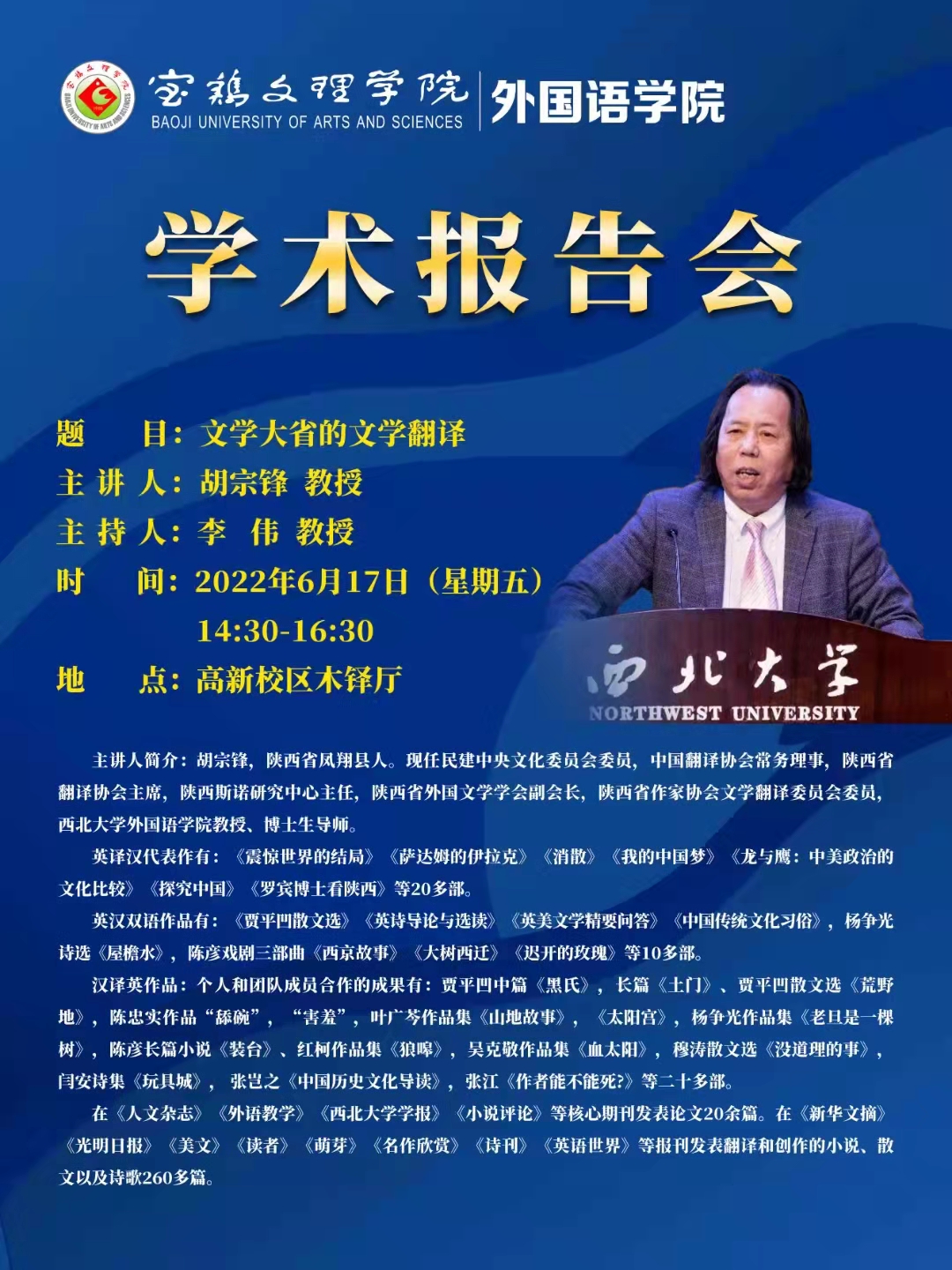 6月17日下午,西北大学胡宗锋教授应邀在高新校区木铎厅为公司师生作了题为《文学大省的文学翻译》的学术报告。报告会由必一运动经理李伟教授主持。外国语公司部分教师及研究生、本科生聆听了报告。