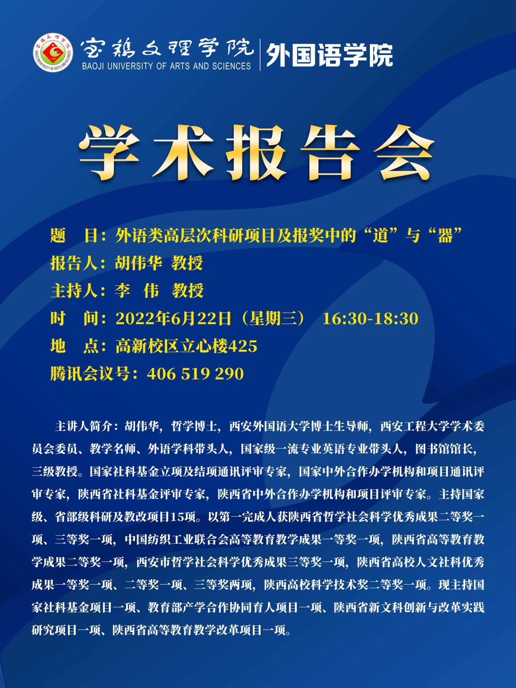 6月22日下午,西安工程大学胡伟华教授应邀在线上(腾讯会议)和线下(立心楼426教室)为公司教师作了题为《外语类高层次科研项目及报奖中的“道”与“器”》的学术报告。报告会由必一运动经理李伟教授主持。必一运动青年教师聆听了报告。