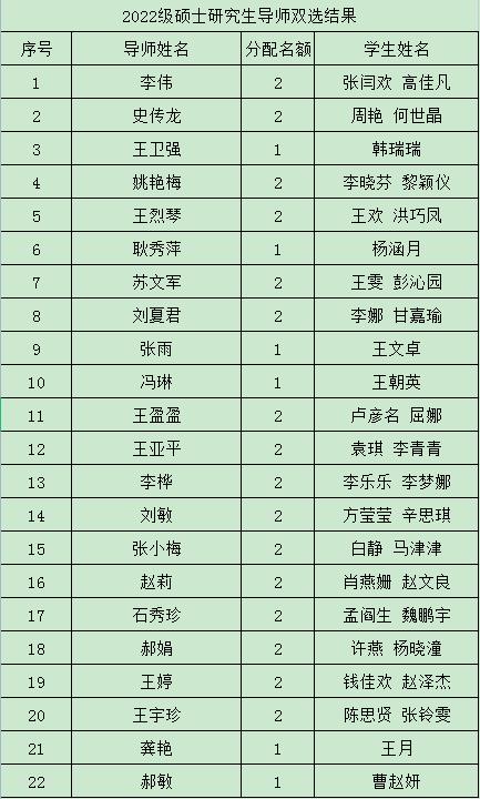 首先,公司发布具备2022级研究生指导资格的导师名单、指导教师简介、联系方式及配额。其次,每名研究生自愿联系具有指导资格的导师。然后,导师根据实际情况并结合研究生本人的志愿选择拟指导研究生向公司报备。最后,公司根据师生意愿,结合公司实际情况,统筹协调后确定最终导师互选结果。符合条件的22位研究生导师和38名2022级研究生,本着公平、公正、公开的原则互选,最终互选结果如下: