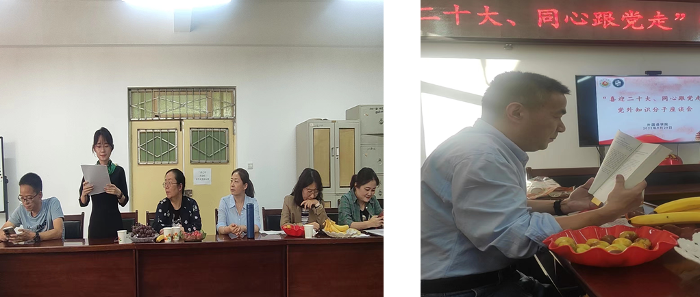 会议还集中学习了中央政治局8月30日会议精神,明确了中国共产党第二十次全国代表大会的召开时间、指导思想、主要事项。周祥红用英文诵读了《习近平谈治国理政》(第四卷)之“民之所忧我必念之,民之所盼我必行之”篇,赵主峰和徐新星两位老师分别朗诵了爱国诗歌《祖国,一生唱不完的恋歌》和《祖国,我不用言语》。(文/ 王阿莉 图/尚春兰 审核/官莉萍)