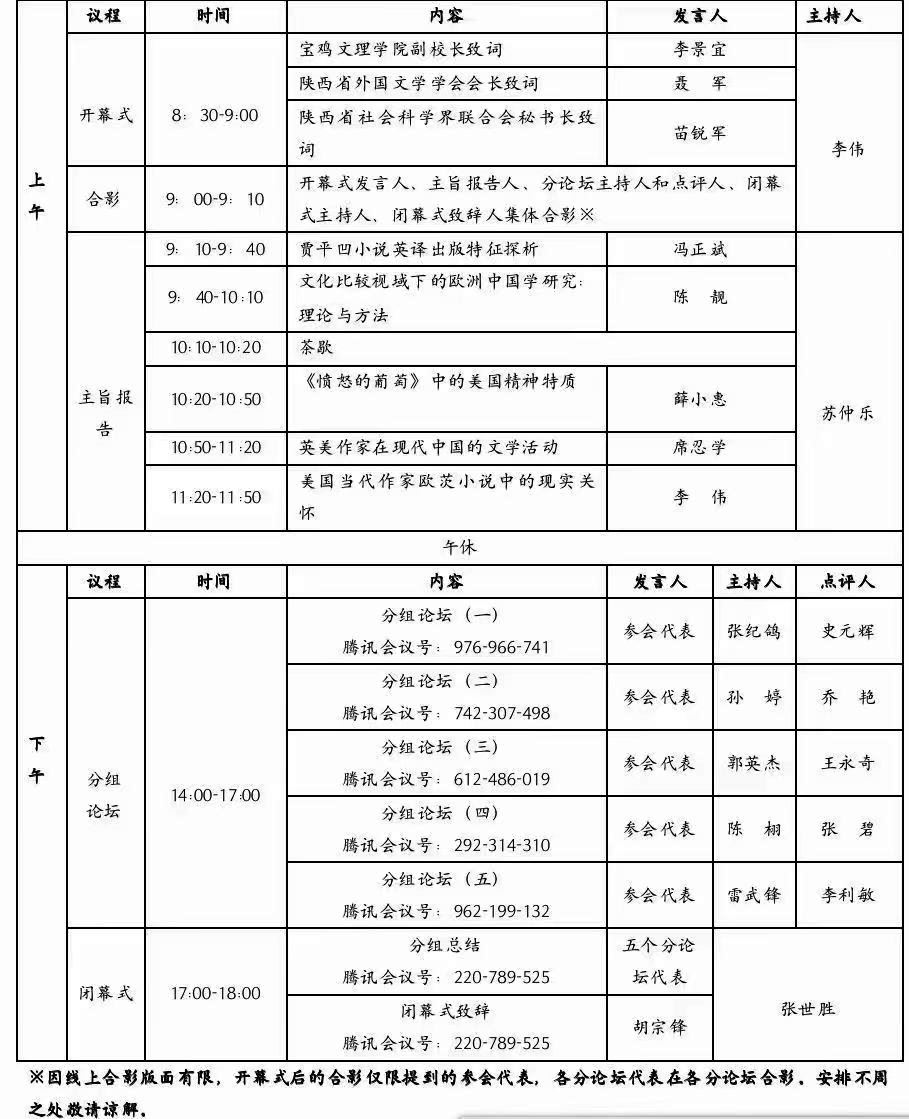 上午的主旨报告环节由陕西师范大学文公司经理苏仲乐教授主持,长安大学冯正斌教授、复旦大学陈靓教授、西安外国语大学薛小惠教授、商洛公司席忍学教授和公司李伟教授等5位代表应邀作了主旨报告。下午的5场分组论坛在腾讯会议的五个分会场进行,与会的专家学者围绕文学的民族性与文化共识、新文科跨学科与外国文学研究、文学思潮与外国文学研究、近现代中外关系与外国文学研究、理论创新与外国文学研究等议题作了精彩发言,进行了讨论。会议闭幕式由学会副秘书长、西安外国语大学张世胜教授主持,5个分组论坛的点评专家总结汇报了各组的发言讨论情况和研究特点和亮点。