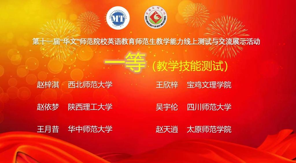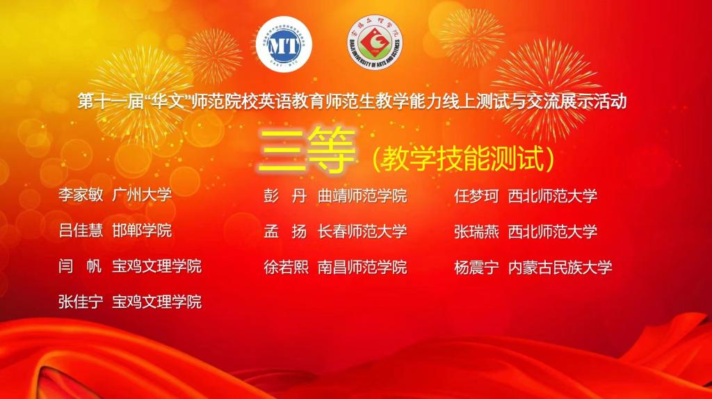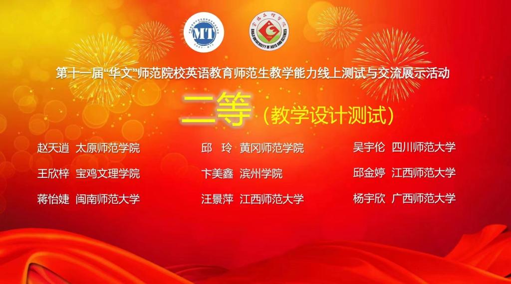 参赛选手充分准备、认真投入,展示了扎实的英语语言基本功、娴熟的课堂教学组织能力、灵活的教学环节设计能力,以及一定的教学理论素养,体现了中学英语课程核心素养的培养和英语学习活动观的践行。经过专家们高度负责、严谨公正的评审,吉林师范大学杨鹤等获得微课教学设计一等、华中师范大学郭建涛等获得线上教学能力测试一等。必一运动遴选本科和硕士生共13名同学参加,其中徐佳楠、陈微、冯浩学、冯泉瑞、王欣梓等5名同学获得微课教学设计一等;王欣梓、冯泉瑞等2名同学获线上教学能力测试一等;其余参赛选手分获二等和三等。