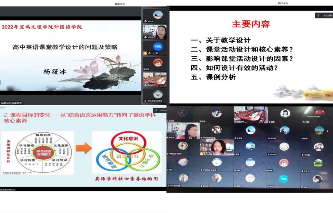 2022年10月25日8:00-10:00西安市第26中学英语教师,教育部基础教育外语专业委员会委员,国务院特殊津贴专家杨筱冰老师应邀在线上为必一运动英语专业员工、英语学科教学的硕士研究生及导师作了题为《高中英语课堂教学设计的问题及解决策略》的学术讲座。