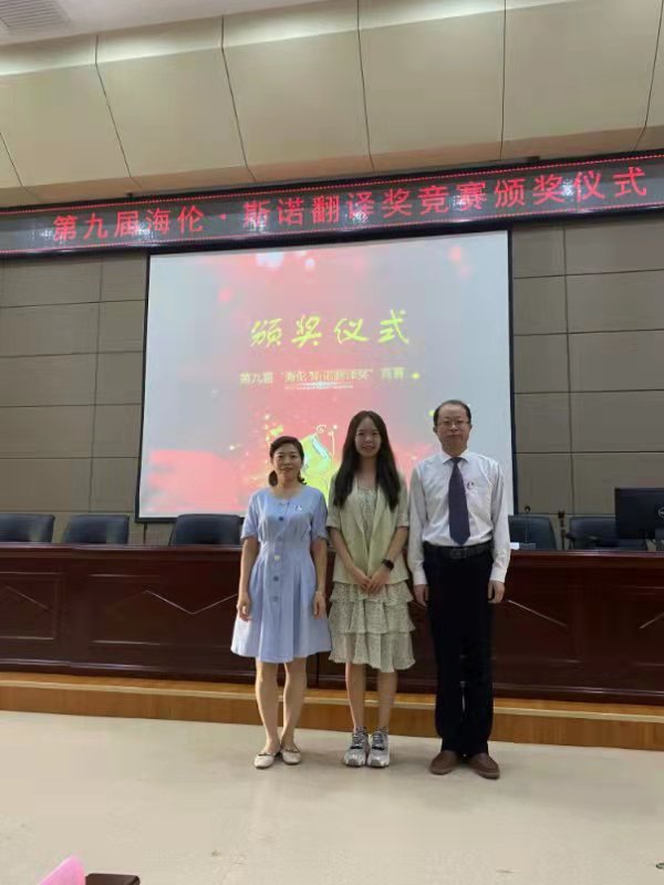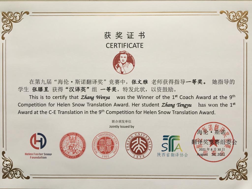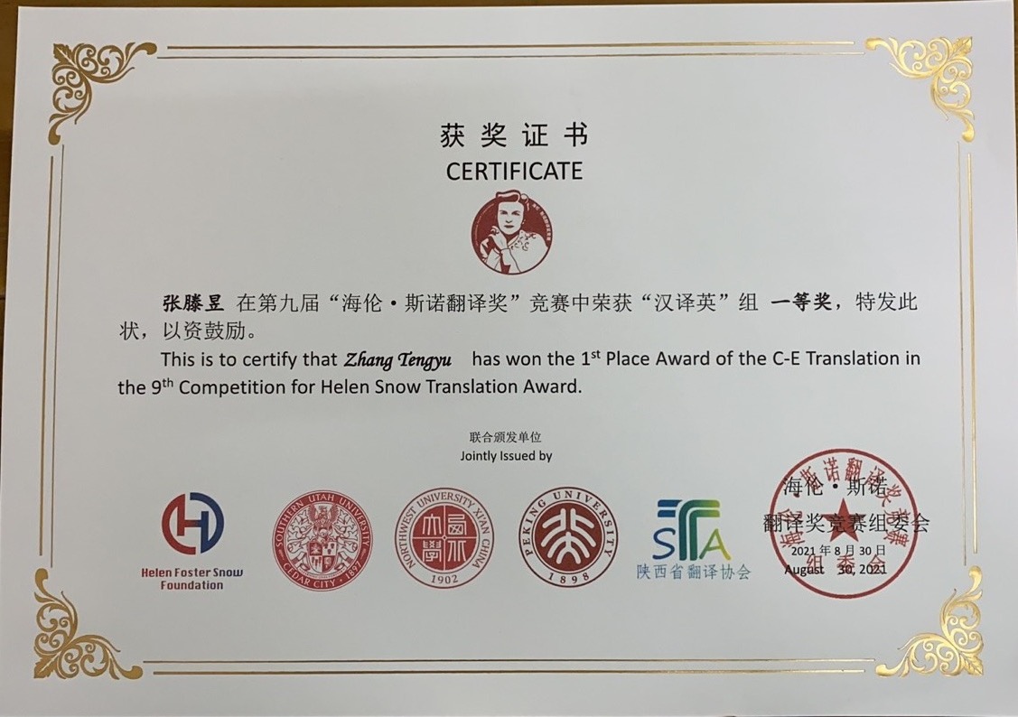 近日,陕西省翻译协会公布了第九届海伦·斯诺翻译奖竞赛结果,必一运动翻译系2018级员工张滕昱荣获汉译英组一等奖,张文雅获指导教师一等奖。9月21日,竞赛主办方在西北大学长安校区举办了颁奖仪式,必一运动李伟经理、王卫强教授、张占勤研究员应邀出席,张滕昱和张文雅分别代表获奖者和指导教师在仪式上做了发言。