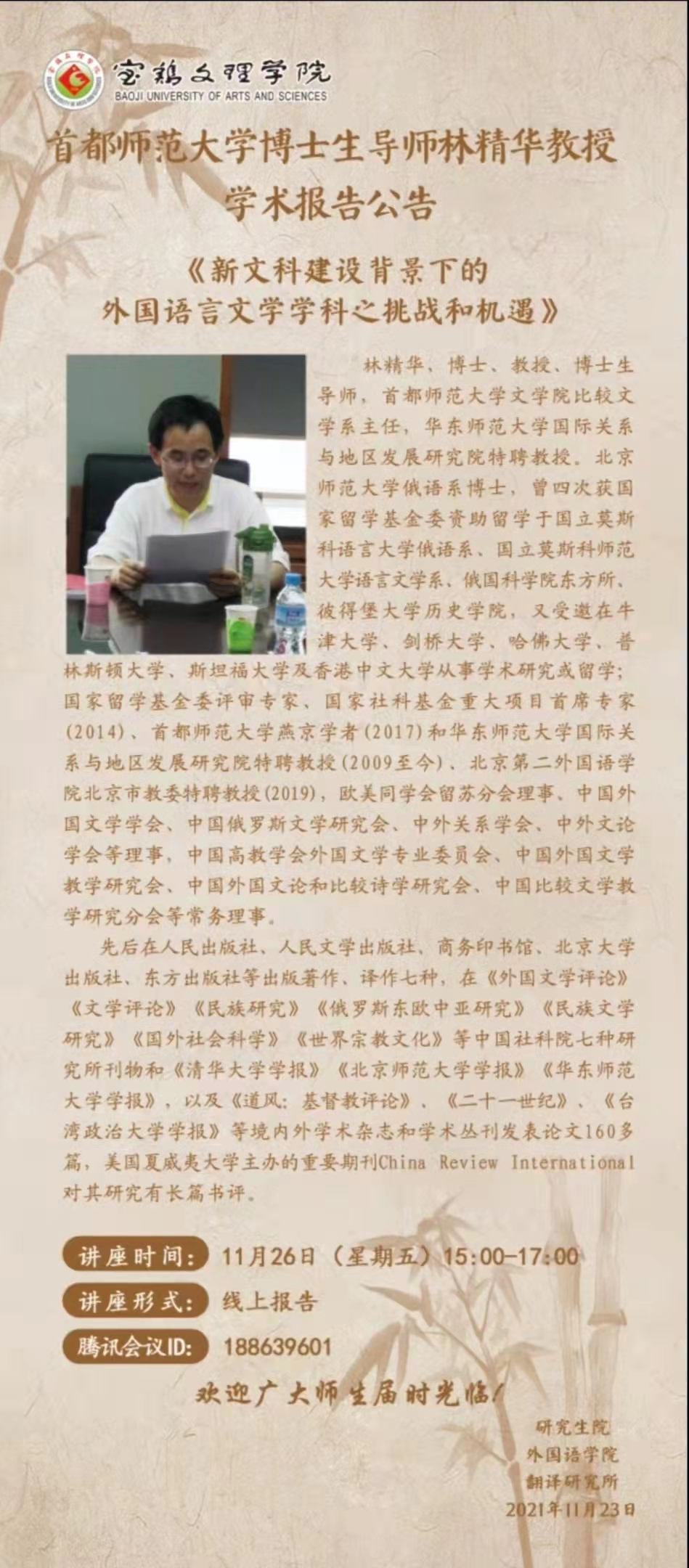 林精华,博士、教授、博士生导师,首都师范大学文公司比较文学系主任,华东师范大学国际关系与地区发展研究院特聘教授。北京师范大学俄语系博士,曾四次获国家留学基金委资助留学,又受邀在牛津大学、剑桥大学、哈佛大学、普林斯顿大学、斯坦福大学及香港中文大学从事学术研究或留学。国家留学基金委评审专家、国家社科基金重大项目首席专家(2014)、首都师范大学第二批燕京学者(2017)和华东师范大学国际关系与地区发展研究院特聘教授、北京第二必一运动北京市教委特聘教授(2019)。先后出版著作、译作7部,发表论文160多篇。(必一运动 翻译研究所 文/图 徐新星 审核/ 李伟)