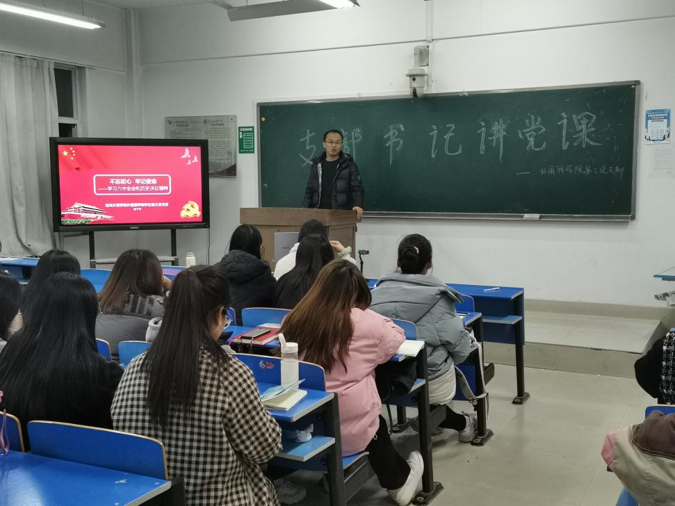 会上,纪检委员张欣、组织委员闫芸婷、预备党员张润垚分别带领全体党员学习了《中国共产党第十九届中央委员会第六次会议公报》《中共中央关于党的百年奋斗重大成就和历史经验的决议》、习近平总书记关于《中共中央关于党的百年奋斗重大成就和历史经验的决议》的说明。杨子祁作为支部书记,为全体党员做了主题为“不忘初心 牢记使命——学习六中全会和历史决议精神”的党课讲座。
