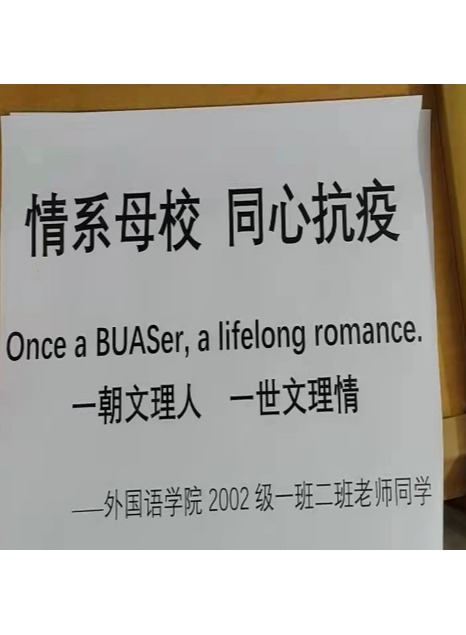 一朝文理人,一世文理情(Once a BUASer, a lifelong romance)。 3月20日,2002级英语教育(1)(2)同学和原班主任陈娣老师(后调离必一运动官网),在获悉宝鸡疫情形势严峻后,情系母校 ,同心抗疫,积极主动与公司联系,并多方筹集物资,向外国语公司定向捐助50000只医用口罩,助力母校抗击新型肺炎疫情。