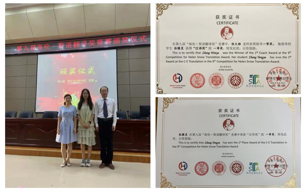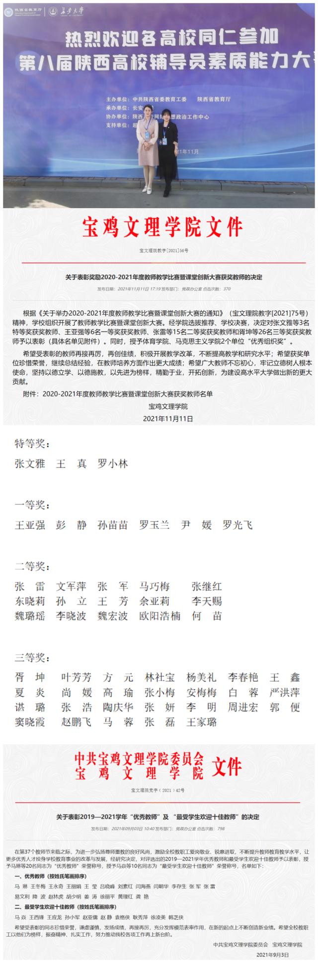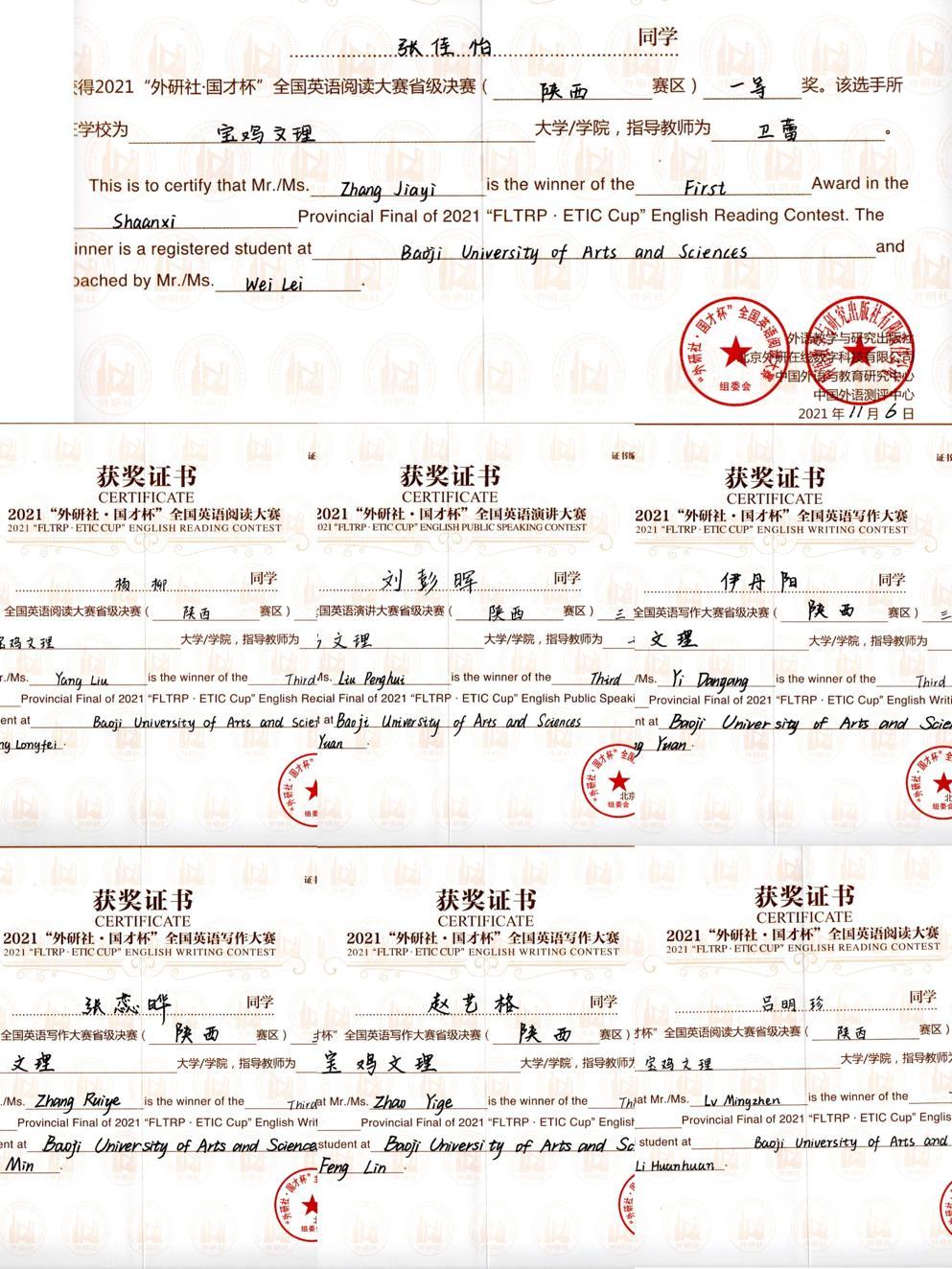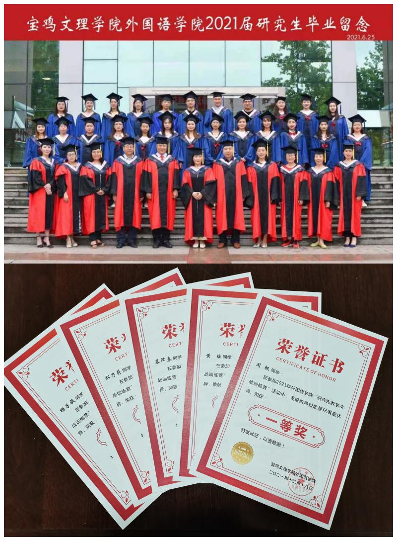 9.团队队伍建设取得新进展。新增4名硕士教师,2名教师考取博士学位,硕博士人数占教师总人数93%;晋升教授1人,副教授1人,讲师1人,助教1人;孙苗苗在第十二届“外教社杯”全国高校外语教学大赛陕西赛区决赛中获得英语专业组二等奖,王娟在第八届陕西高校辅导员素质能力大赛中荣获二等奖,耿秀萍、闫朝华、龚艳分获公司“最受员工欢迎十佳教师”、2019-2021学年“优秀教师”称号。在公司2020-2021年度教师教学比赛暨课堂创新大赛中,张文雅获得特等奖,孙苗苗获得一等奖,张小梅获得三等奖。