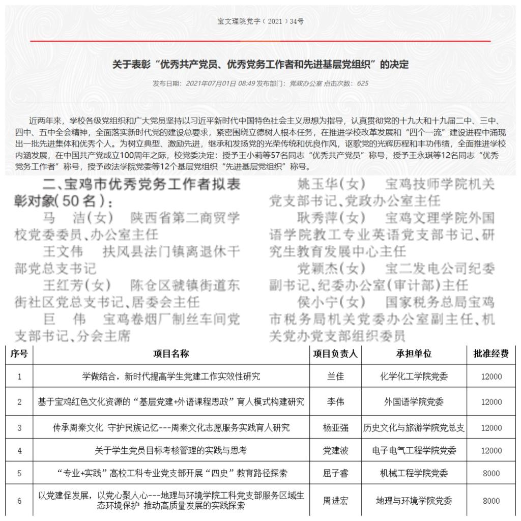 1. 精心组织实施,有力有序推进党史学习教育和建党100周年系列庆祝活动。全体师生受到了一次全面深刻的政治教育、思想淬炼和精神洗礼,满怀信心奋进新征程,建功新时代。公司党委连续第三次获得公司“先进基层党组织”称号,耿秀萍获得宝鸡市优秀基层党务工作者,教工党员耿秀萍、李伟、员工党员张玲娟被评为校级“优秀共产党员”。