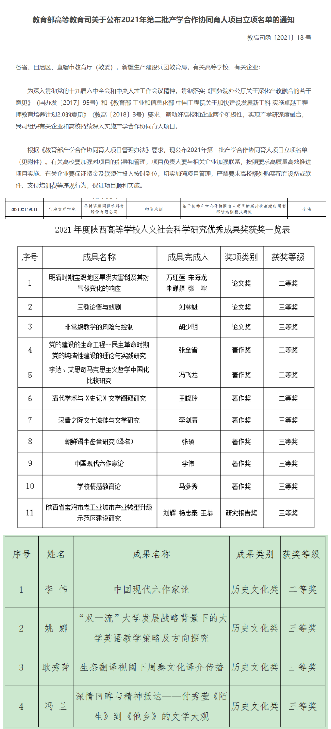 4.科研工作取得新成效。全年获批各级科研项目31项,其中纵向项目获批13项,张硕博士获批国家社会科学基金西部项目《〈朝鲜语借字表记字典〉编撰》,横向项目获批18项,科研经费到账134万。出版专著1部,公开发表学术论文共17篇。获2021年度陕西高等公司人文社会科学研究优秀成果奖三等奖2项、宝鸡市哲学社科优秀成果二等奖1项、三等奖3项。
