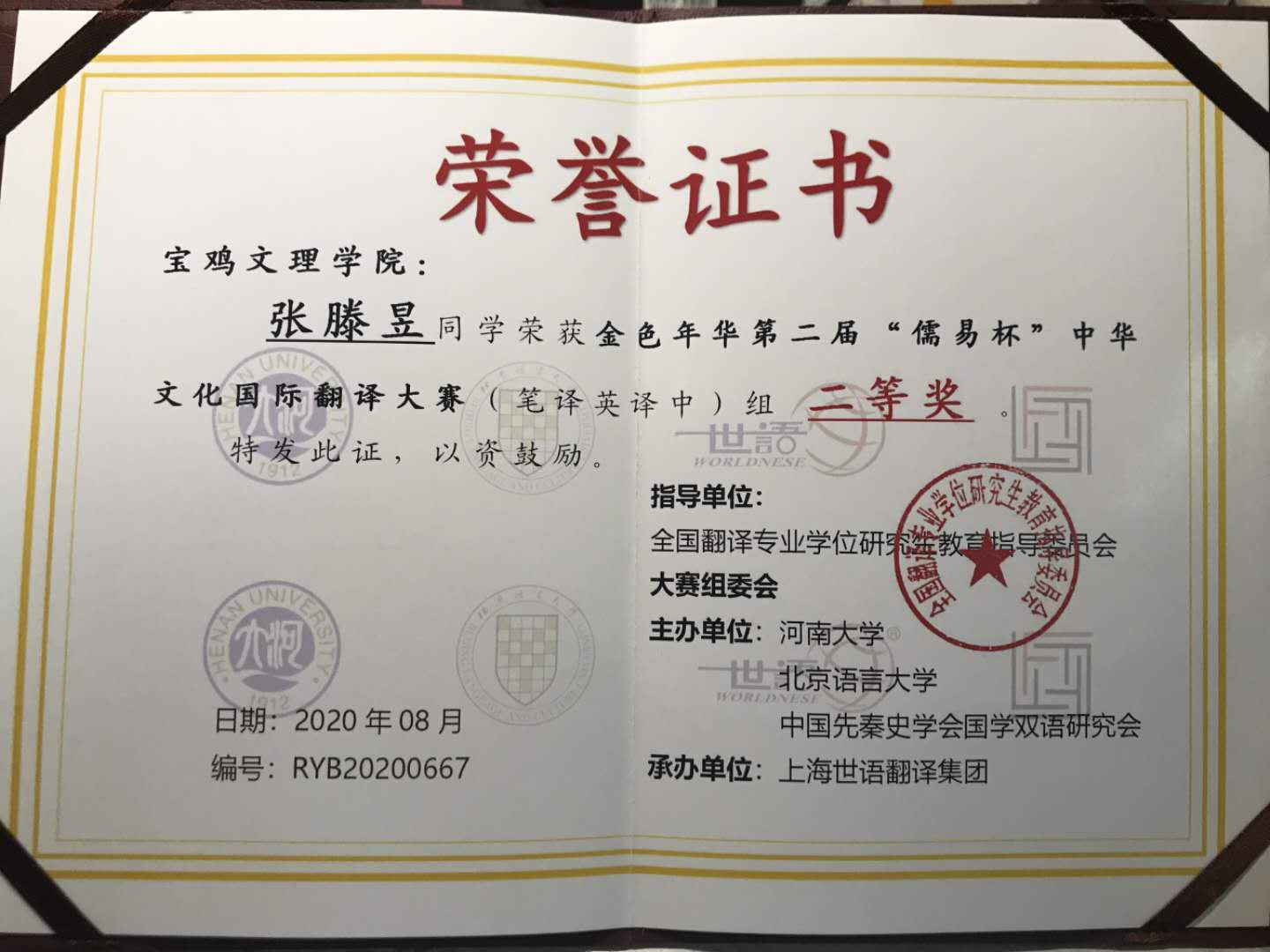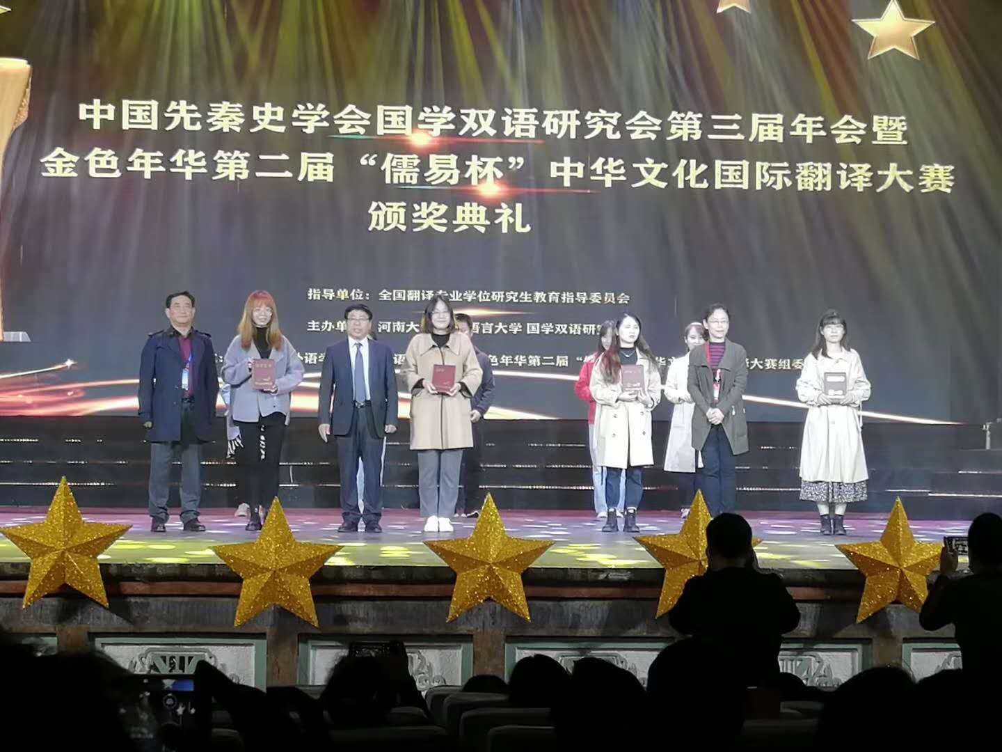 25日下午,第二届“儒易杯”中华文化国际翻译大赛的笔译及口译颁奖典礼在国家级文物保护单位河南大学明伦校区大礼堂举行,外语公司张滕昱同学上台领奖。