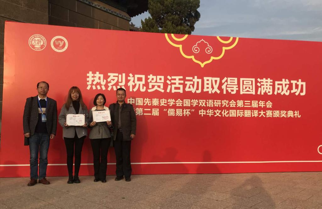 10月24日至25日,中国先秦史学会国学双语研究会第三届年会暨金色年华第二届“儒易杯”中华文化国际翻译大赛颁奖典礼在河南大学举行。公司外语公司副经理李伟、翻译系副主任张文雅、实验教学中心副黄龙飞和荣获笔译全国二等奖的18级翻译系员工张滕昱参加了此次年会与颁奖典礼。