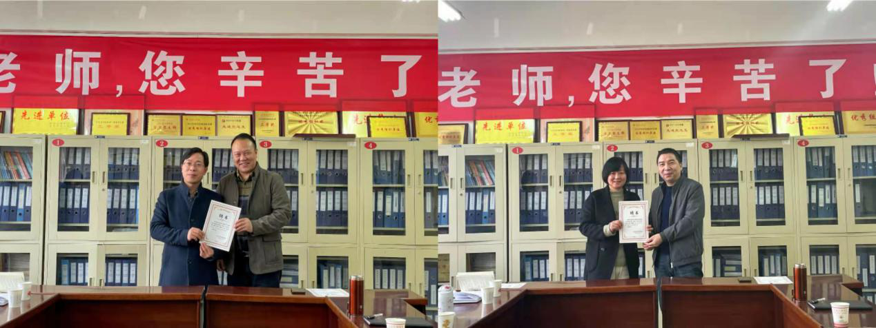在颁证环节,史传龙简要介绍了张哲华、胡卫卫、刘子富、刘燕、钱莉等五位第二导师的基本情况,与王卫强一道为安康公司第二导师代表张哲华、钱莉颁发聘书,并合影留念。