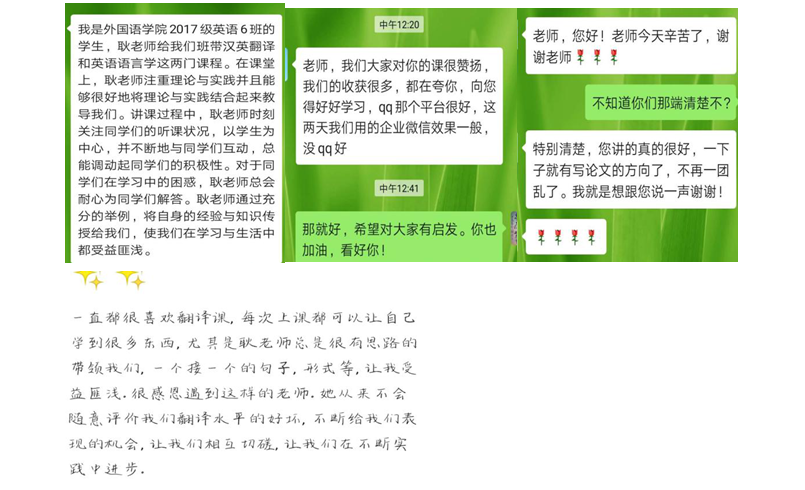 作为外语公司教学督导组副组长,在网络授课期间,耿秀萍老师随时关注员工的学习状况,及时了解网络授课的教学效果,询问员工的反馈意见,不断完善和改进教学方法,所授课程也得到员工的认可。员工和其他校级教学督导也给耿老师发来了反馈信息。