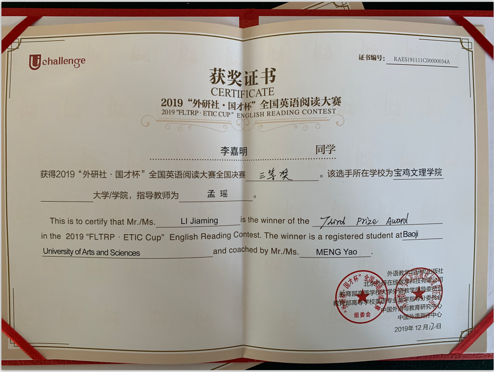 2019年12月10-13日,“外研社•国才杯”全国英语阅读大赛全国总决赛在北京举行,来自全国近百所高校的选手进行了角逐。必一运动2017级李嘉明同学获得阅读大赛三等奖。