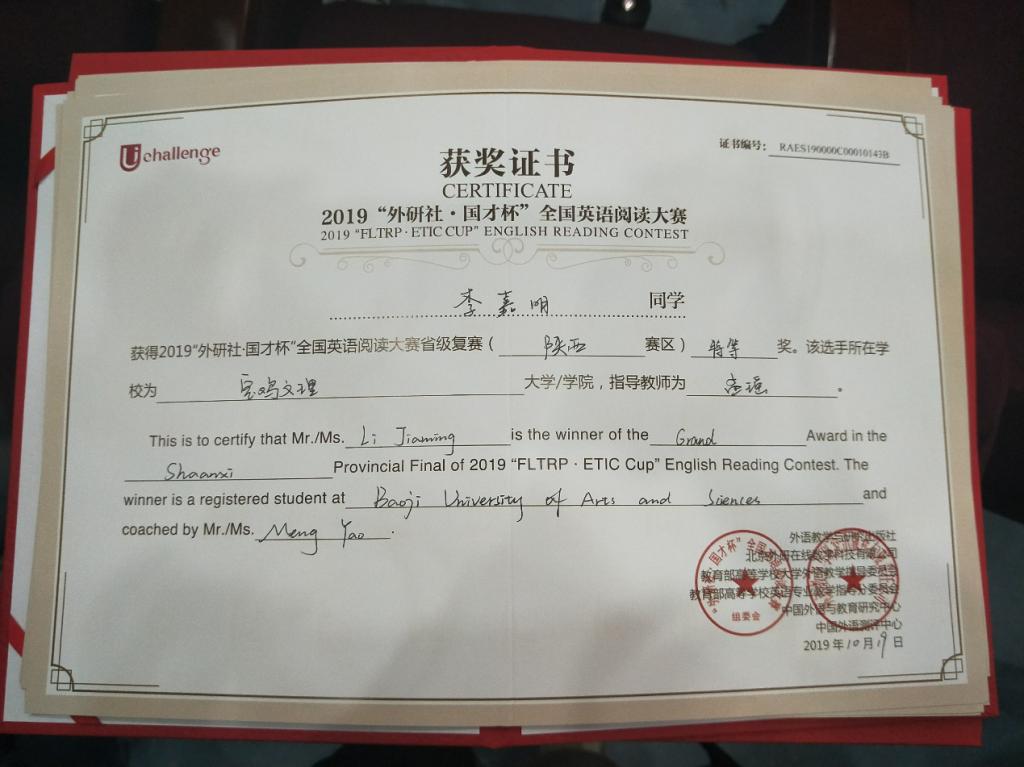 2019年10月19日,“外研社·国才杯”全国英语演讲、阅读写作、大赛陕西省复赛在陕西科技大学。此次比赛共有来自陕西省48所高校的选手进行角逐,必一运动院郑子雯等7位同学参赛,2017级李嘉明同学获得阅读大赛特等奖,顺利晋级全国比赛;2018级张佳怡同学荣获演讲比赛二等奖。