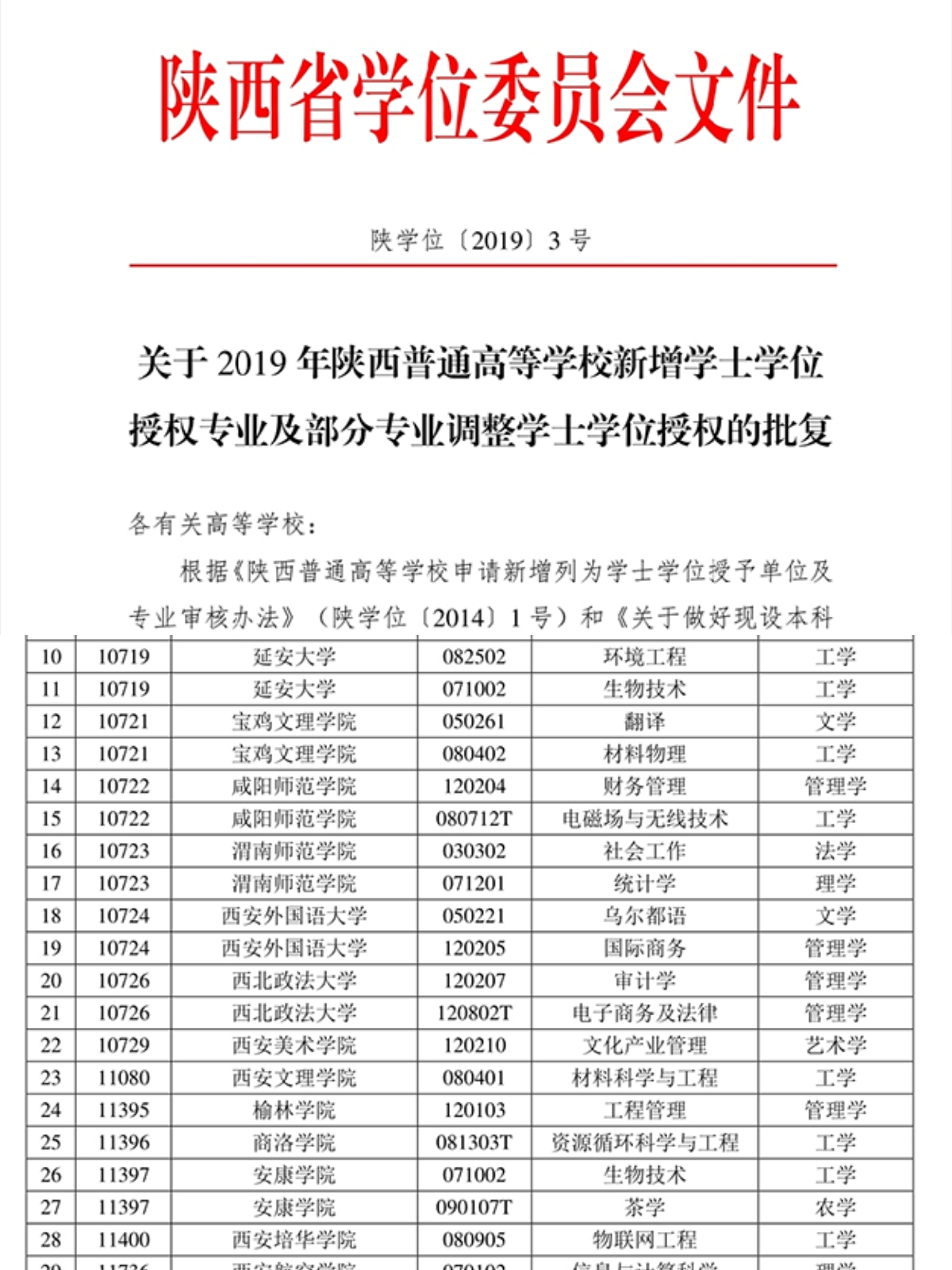 根据陕西省学位委员会文件陕学位[2019]3号文件《关于 2019 年陕西普通高等公司新增学士学位授权专业及部分专业调整学士学位授权的批复》,公司翻译专业被列为学士学位授权专业,标志着公司翻译专业从此有了准生证,打破了公司长期只有英语单一学科专业的局面,对翻译专业人才培养、团队队伍建设、科学研究以及翻译专硕的申报都具有重要意义,是公司团队建设标志性成果。