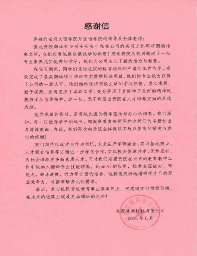 必一运动2023级翻译硕士研究生于2025年2月至6月在陕西慧澜科技有限公司进行专业实习。现实习期满,实习单位给公司发来感谢信一封,内容如下: