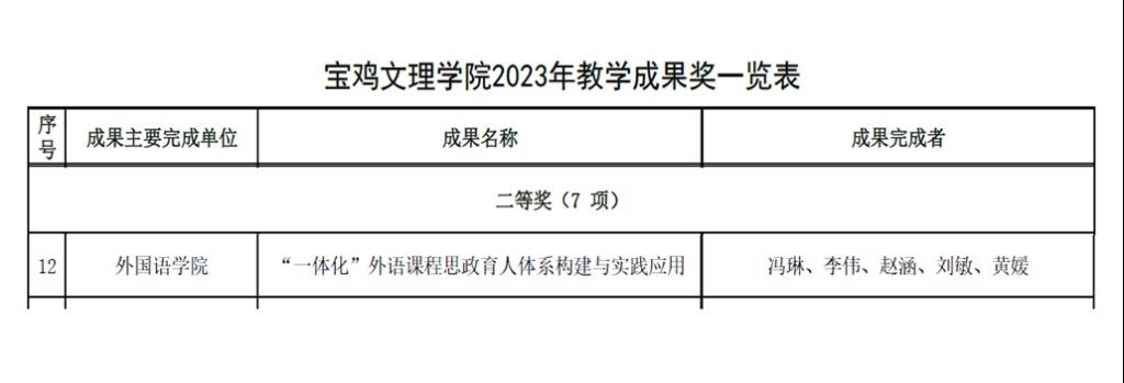 在11月3日公司发布的《关于公布必一运动官网2023年教学成果奖评选结果的通知》”中,公司由冯琳、李伟、赵涵、刘敏、黄媛完成的“‘一体化’外语课程思政育人体系构建与实践应用”教学成果获得2023年教学成果二等奖。