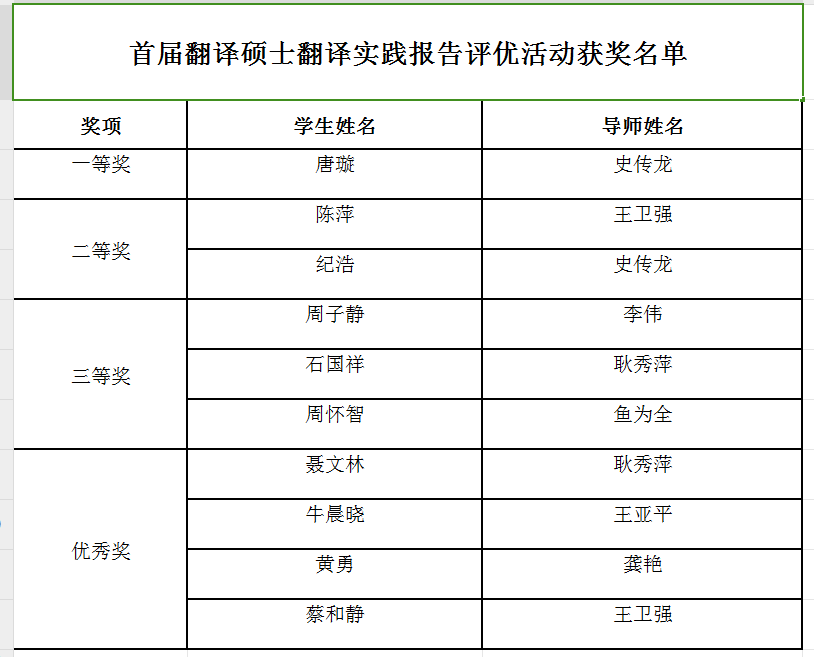 首届翻译硕士翻译实践报告评优活动获奖名单