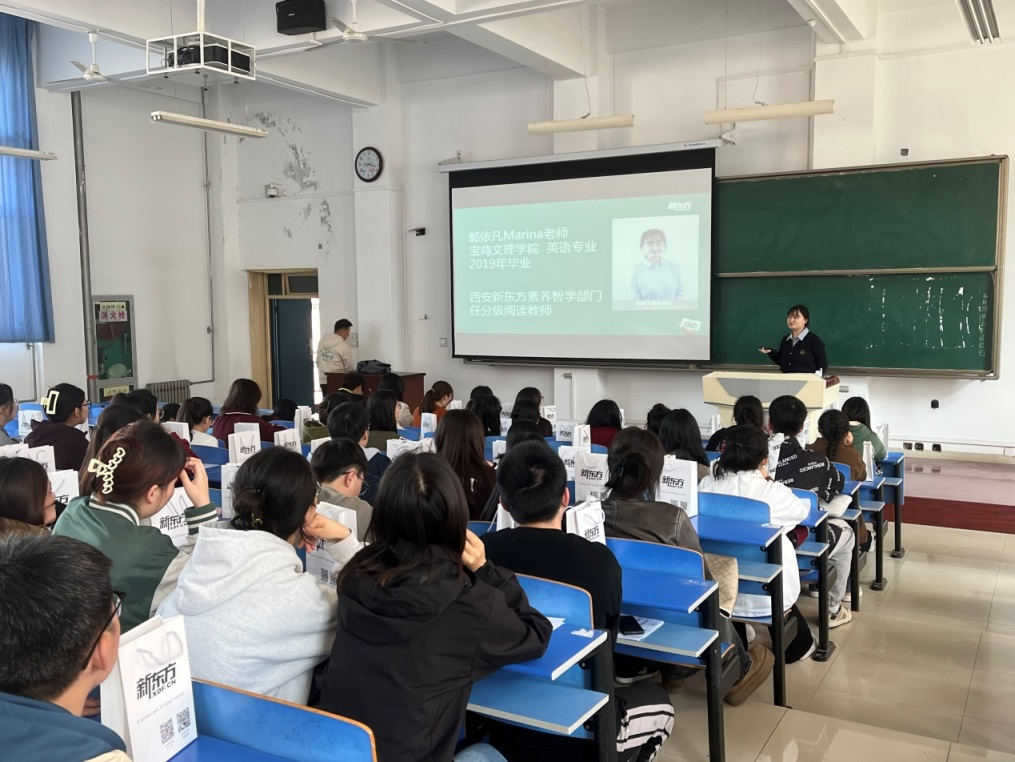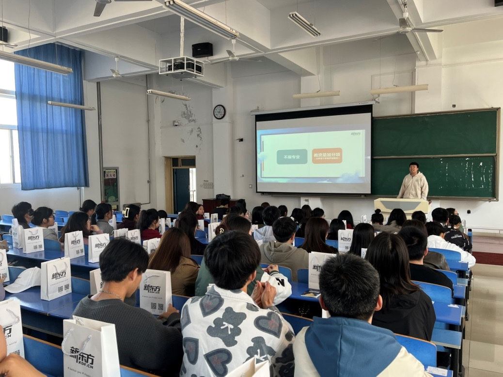 新东方西安公司的招聘负责人代老师向在场师生介绍了该机构的创立背景、经营理念、发展历程以及分布现状,并详细介绍了新东方的员工培训体系,职业发展路径,薪资待遇以及面试流程等重要信息。