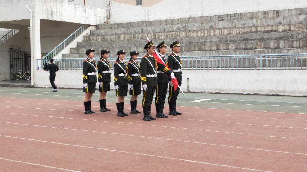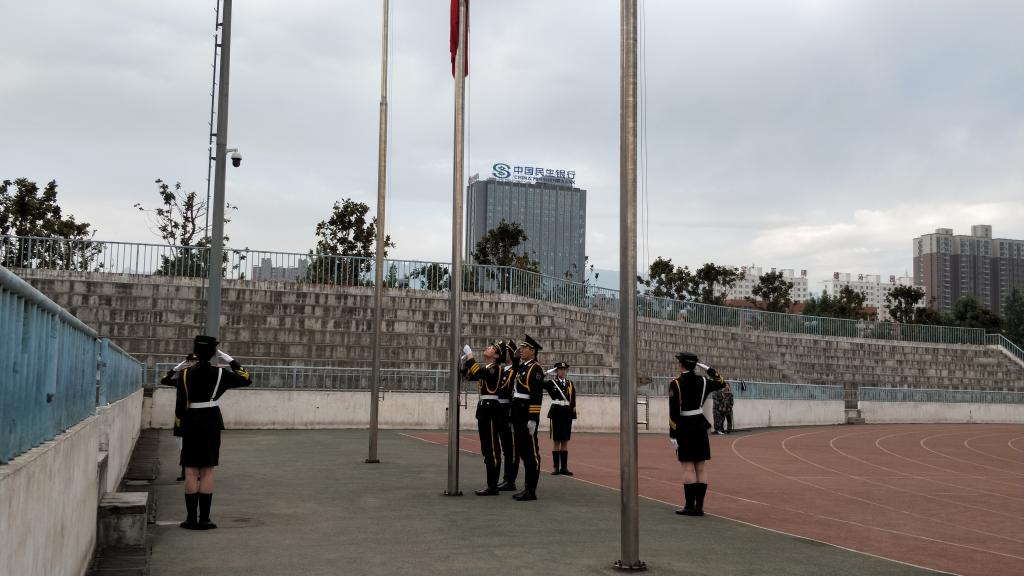 升国旗仪式于6:40准时开始。校国旗班踏着庄严矫健的步伐护送着五星红旗进场。伴随着义勇军进行曲的奏响,五星红旗冉冉升起。同学们面对国旗,庄严肃立,行注目礼。升国旗仪式结束后,2017级员工翻译一班员工许泽圆以“青春红五月,携手一起走”为题进行了国旗下的演讲,表明对建设更强大中国的决心。段振业在总结讲话中勉励全体员工在红色五月中追忆革命先烈的同时,要树立远大的爱国主义信念,不忘国耻,牢记使命,为实现中华民族伟大复兴而不懈奋斗。